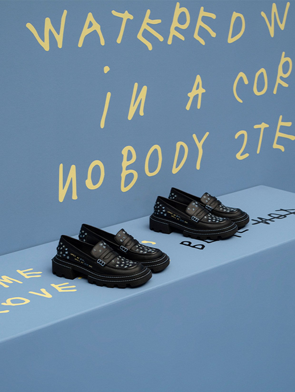 من منطلق إيمانها بأن "الكلمات يمكن أن تتجاوز الثقافات وتعطينا بصيص أمل لأوقات أكثر إشراقًا"، فإن عمل كوكو كابيتان يتميز بالبرائة و السحر الشبيه بمرحة لأطفال، لكنها عميقة بشكل غير متوقع. مطرزة بأزهار اللاقحوان الزرقاء - بالإضافة إلى عبارة , “Loves Me Blue, Love Me Blue Not.” — تأخذ أحذية البيني لوفر من برلين إلى حياة جديدة مميزة.